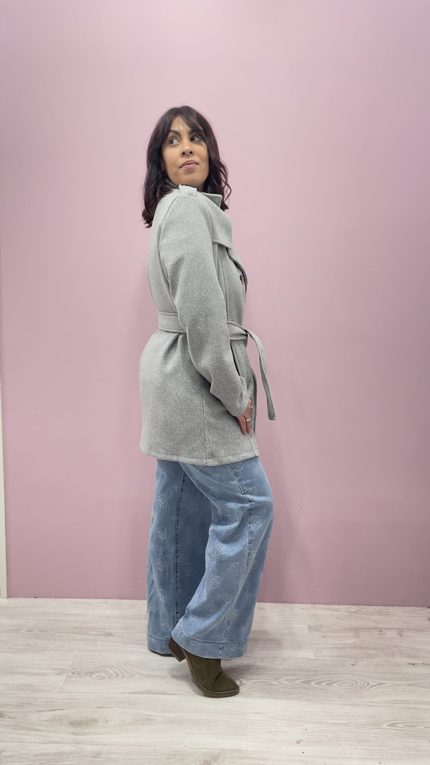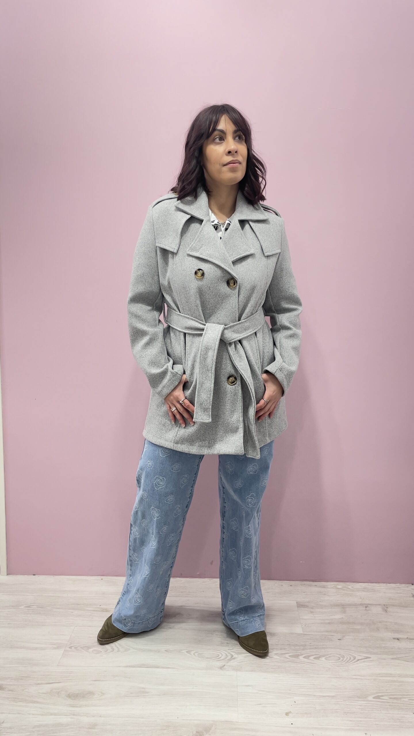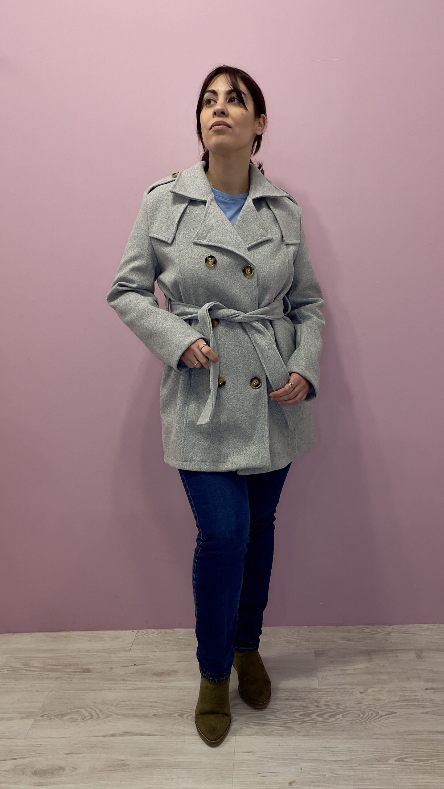Abrigo tipo trench para mujer en color gris. Diseño elegante y atemporal con doble botonadura y cinturón ajustable para realzar la silueta. Tejido y cálido confortable, ideal para los días frescos. Cuello clásico y solapas anchas que aportan un toque cómodo. Perfecto para combinar con jeans o vestidos y crear looks versátiles para cualquier ocasión.