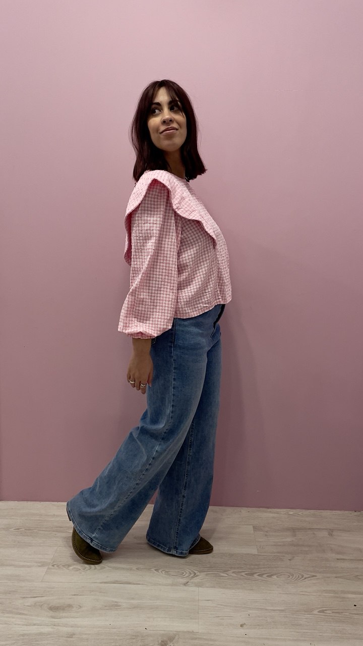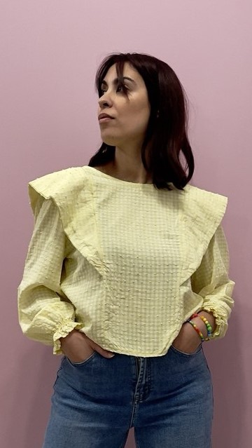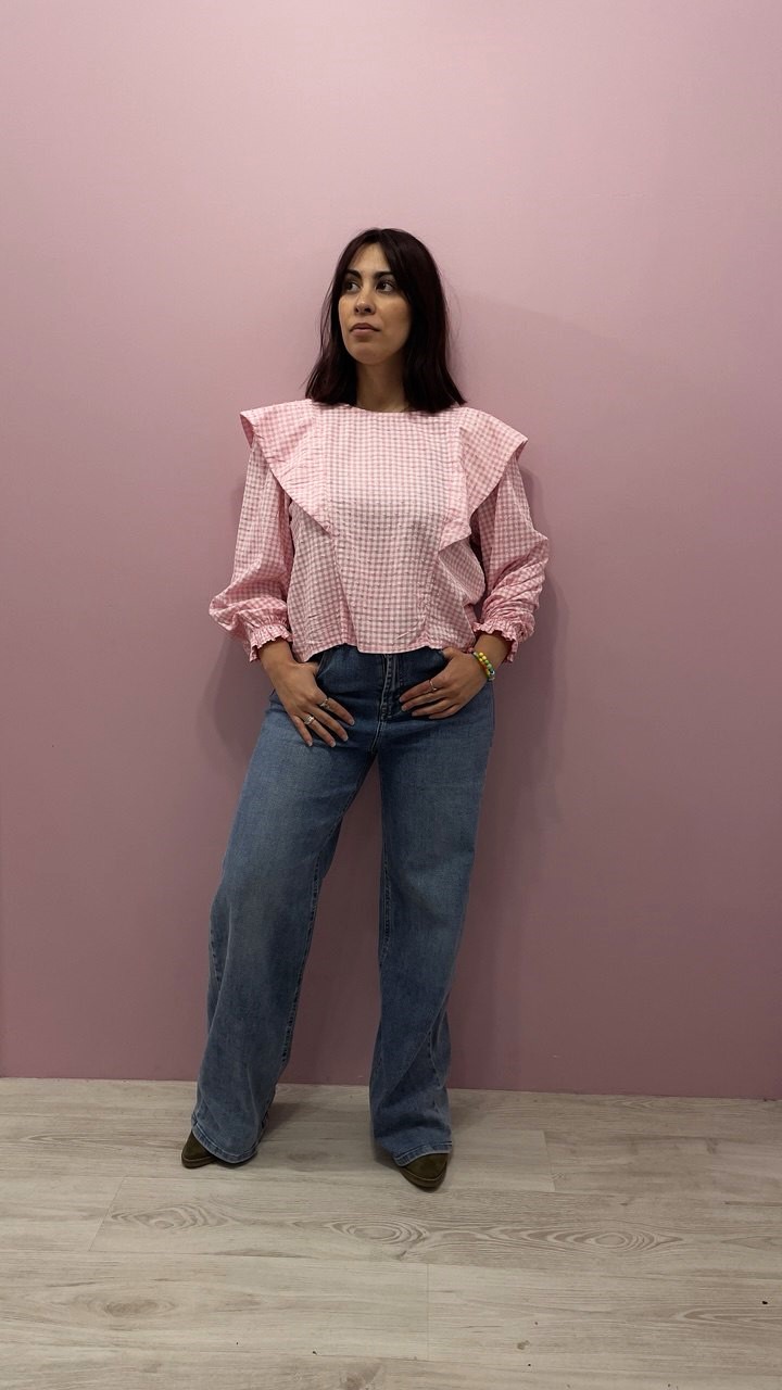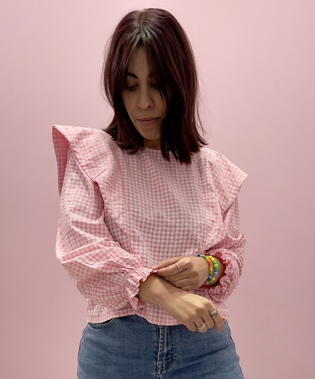 Blusa Camila , una prenda que combina estilo y comodidad a la perfección. Su diseño de cuadros aporta un aire moderno y juvenil, mientras que el volante en el hombro a sisa le da un acabado delicado y elegante.GRATIS