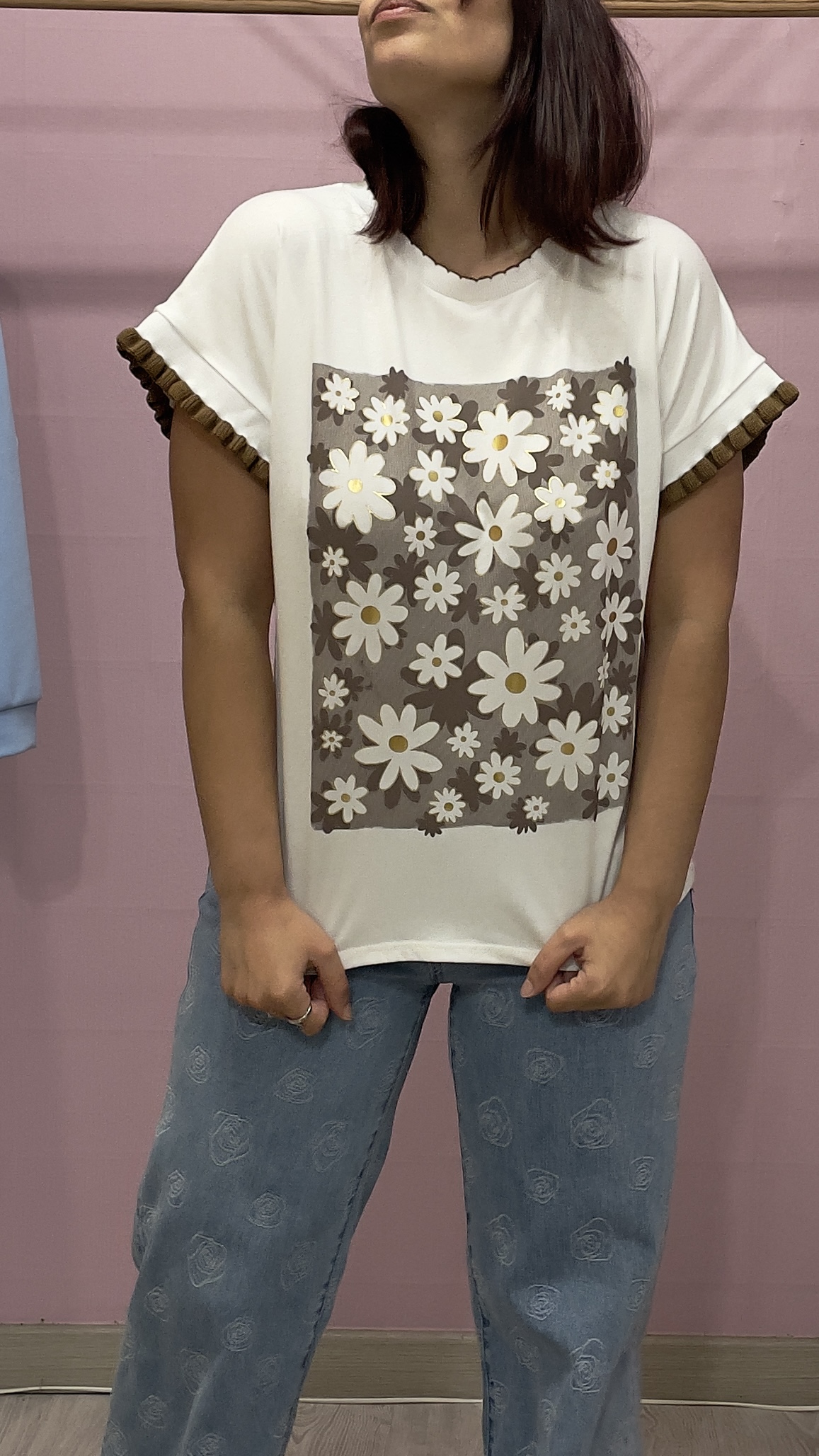 L铆a es esa camiseta que te alegra el d铆a. Con un estampado de flores delicadas y una cenefa del mismo tono en las mangas y cuello, aporta ese toque especial que eleva cualquier look b谩sico. Su corte c贸modo y su tejido ligero la convierten en una aliada ideal para los d铆as c谩lidos, sin renunciar al estilo.