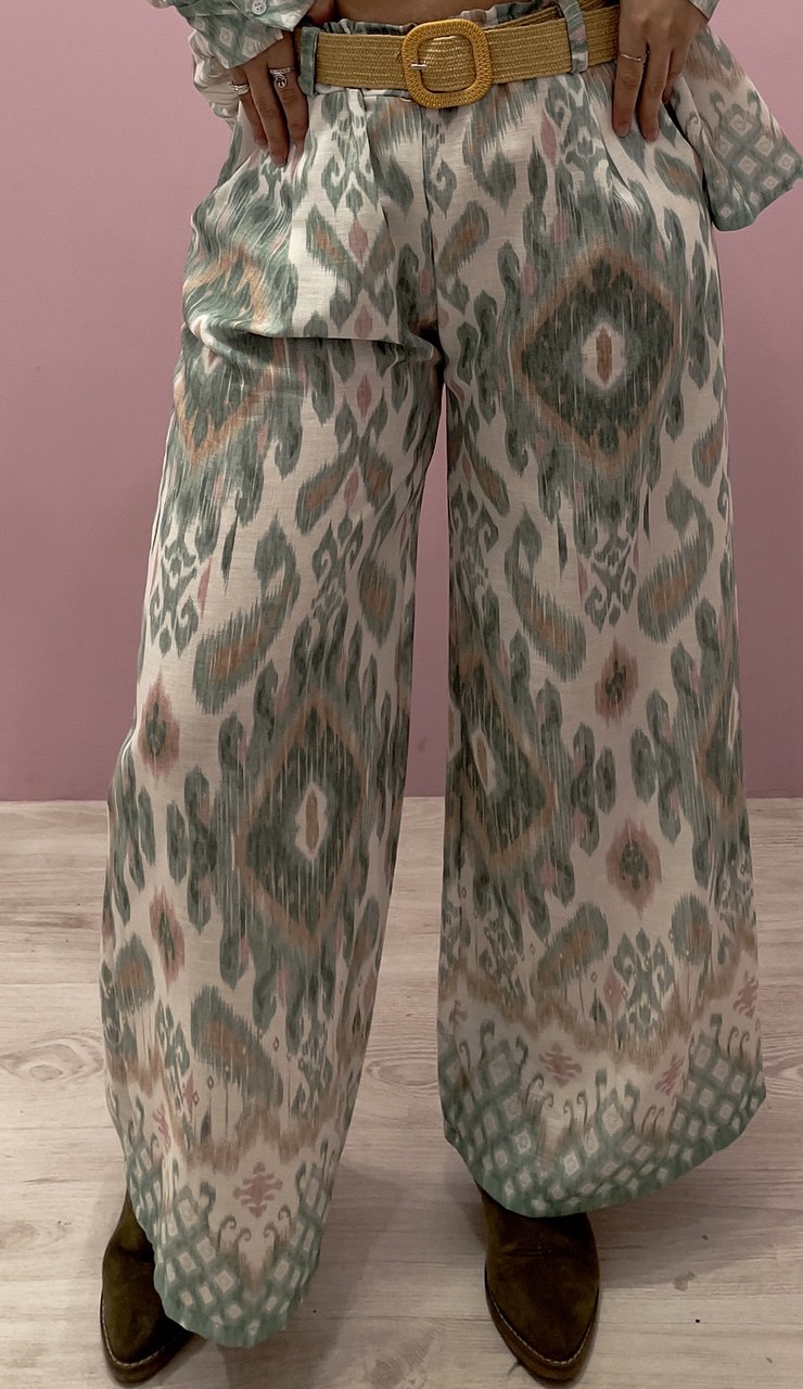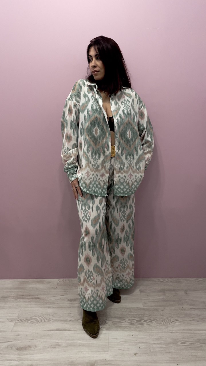El estampado étnico en una armoniosa combinación de verdes lo convierte en una prenda llamativa pero fácil de combinar. La camisa de estilo oversize añade un aire relajado y actual, mientras que el pantalón acampanado con cintura elástica se adapta con suavidad al cuerpo, realzado por un precioso cinturón de rafia que aporta ese toque natural y bohemio que marca la diferencia.