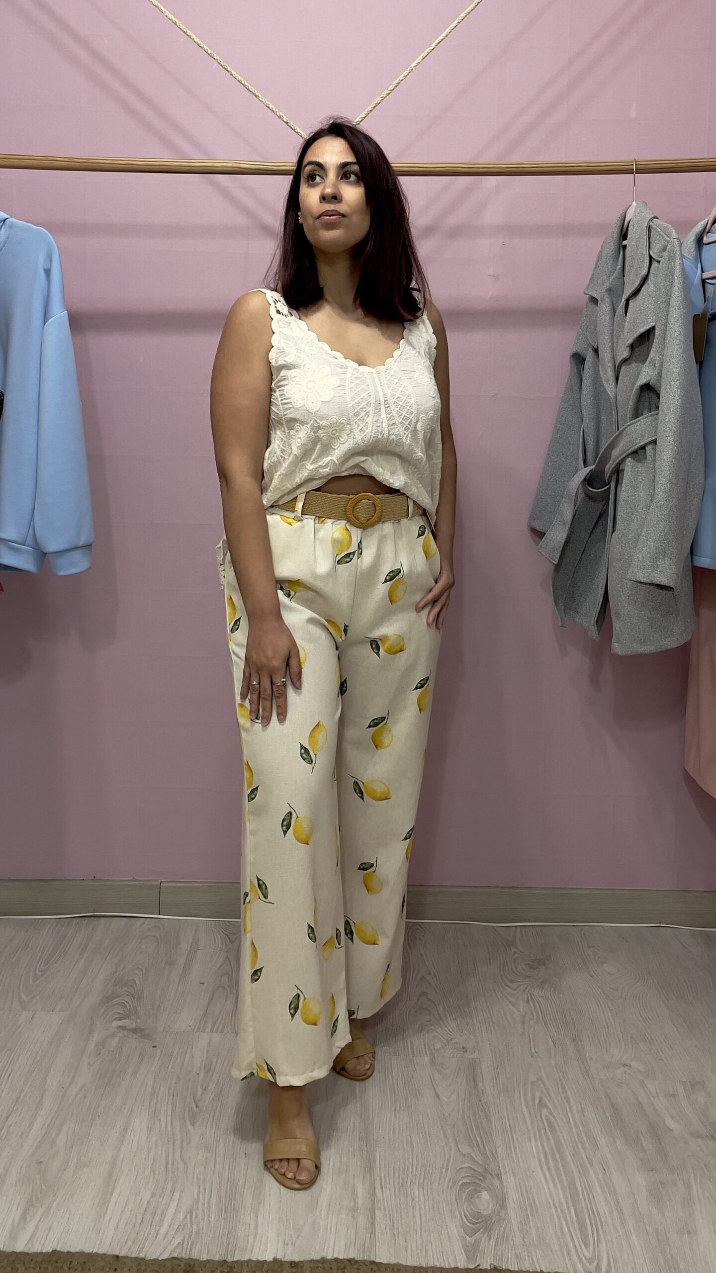 Pantalón de mujer de corte recto ancho en beige con estampado de limones. Un diseño moderno y versátil que combina la comodidad con un toque femenino y actual. Su silueta amplia aporta un ajuste relajado y favorecedor, ideal para un look casual y estilizado. Perfectos para combinar con camisetas, blusas o chaquetas y crear outfits únicos.